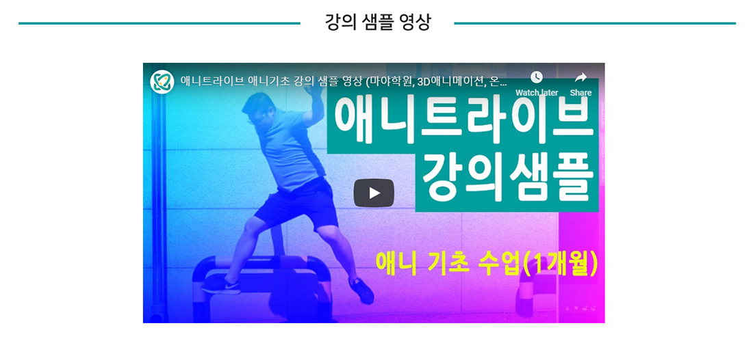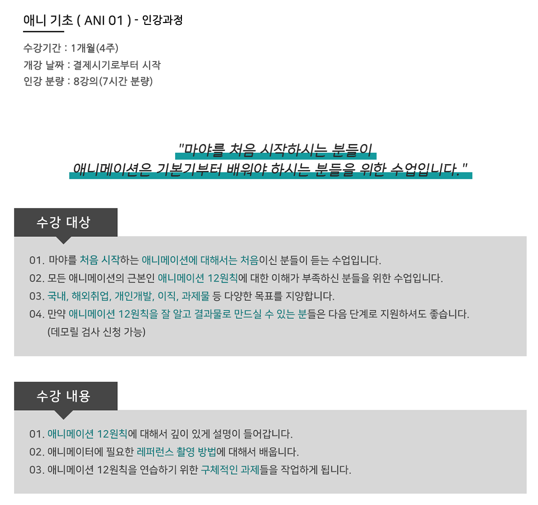 인강)애니 기초과정 (ANI 1) 맛보기 강좌정보 선생님 장영수 보기 수강신청 수강신청 가능 수강기간 30일 학습시간 커리큘럼 0차시 학습방식 커리큘럼 순차 수강방식 수강기기 PC, 모바일 적립금 사용가능 인강)애니 기초과정 (ANI 1) 가격 330,000원 상품금액 330,000원 원 적립예정 장바구니 바로 구매하기 강좌소개 커리큘럼 구매하기 강좌소개 커리큘럼 강좌 회차별 커리큘럼 안내입니다. 강좌의 진행에 따라 변경 될 수 있습니다. 회차(차시) 커리큘럼명(차시명) 샘플강좌 강의시간 커리큘럼을 준비중입니다.
